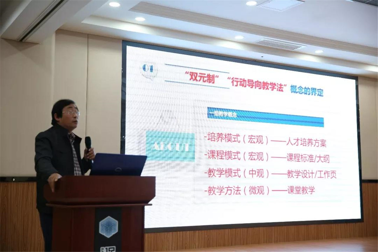 接下来教务处处长崔志锋分享了名为《行动导向教学法的再认识再实践》的汇报内容,通过对“行动导向教学法”概念的界定,对行动导向教学法的培养模式、课程模式、教学理念、教学模式、教学方法的外延和内涵进行了分析,帮助教师们进一步梳理了行动导向教学法的教学理念和模式。