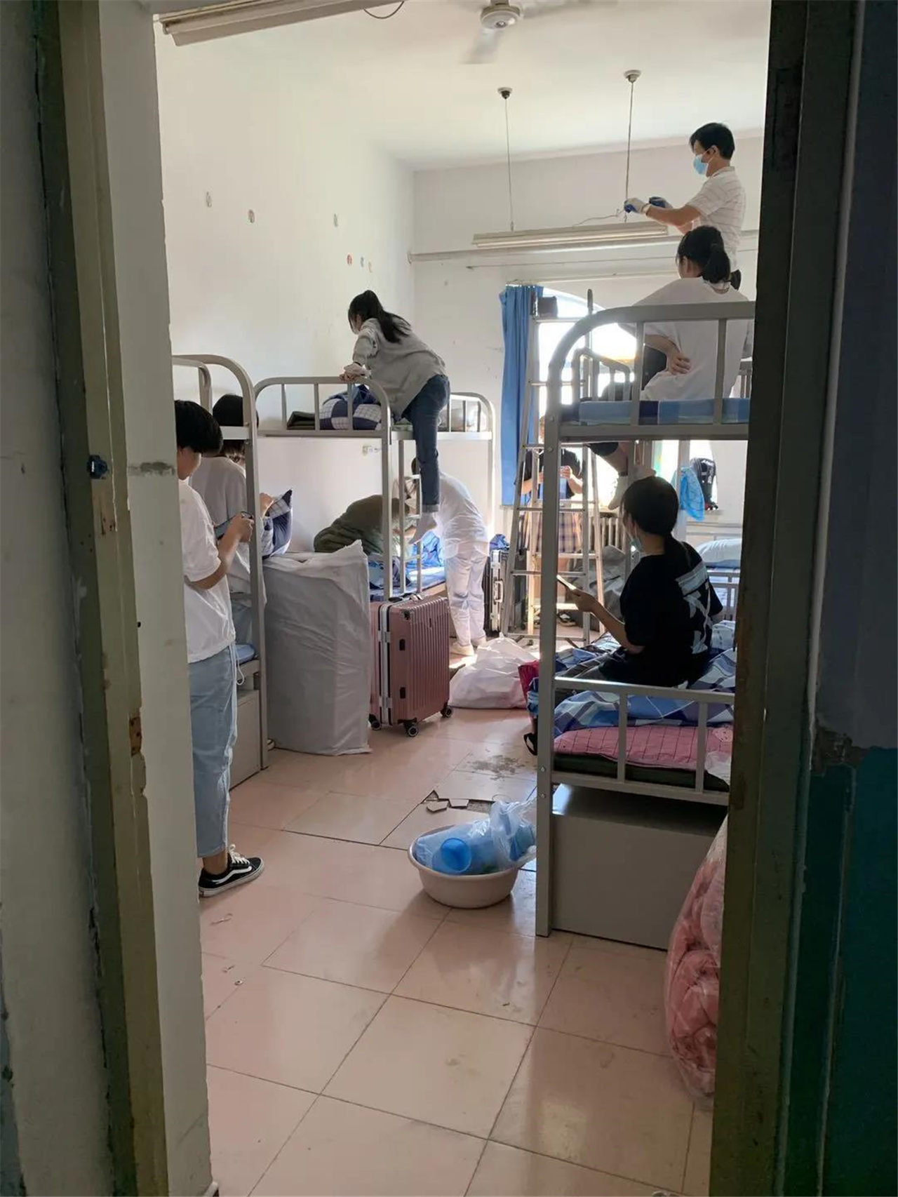 利用超长假期,学校对宿舍楼进行了统一装修??埃1N来σ淹瓿闪税踩寂挪?,后勤处清理了环境卫生,每日进行消杀,为新生们筑起了安全屏障。同学们在志愿者的引导下领取生活用品,找到宿舍,开始新“家”。