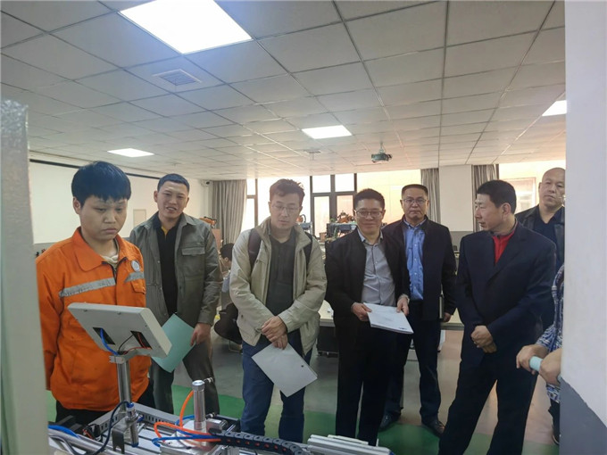 然后,到二楼电气实训车间参观,车间实习学生介绍相关实训设备的使用情况。